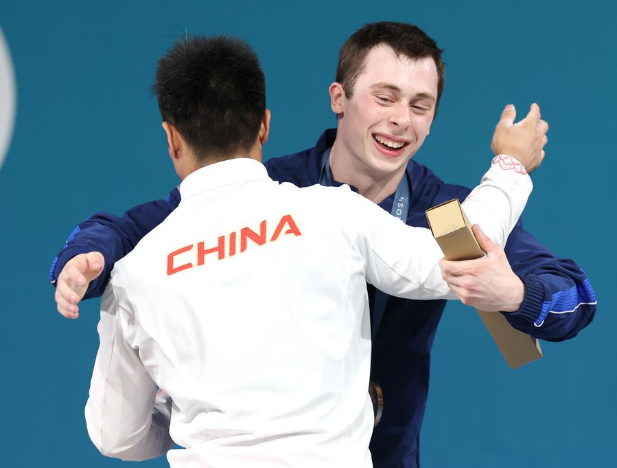 Gold medalist Li Fabin (C) of China, silver medalist Theerapong Silachai (L) of Thailand and bronze medalist Hampton Morris of the United States pose for photos during the victory ceremony of weightlifting men's 61kg competition at the Paris 2024 Olympic Games in Paris, France, on Aug. 7, 2024. (Xinhua/Yang Lei)Gold medalist Li Fabin (C) of China, silver medalist Theerapong Silachai (L) of Thailand and bronze medalist Hampton Morris of the United States pose for photos during the victory ceremony of weightlifting men's 61kg at the Paris 2024 Olympic Games in Paris, France, on Aug. 7, 2024. (Xinhua/Fei Maohua)Li Fabin of China competes during the weightlifting men's 61kg competition at the Paris 2024 Olympic Games in Paris, France, on Aug. 7, 2024. (Xinhua/Yang Lei)Li Fabin of China competes during the weightlifting men's 61kg competition at the Paris 2024 Olympic Games in Paris, France, on Aug. 7, 2024. (Xinhua/Fei Maohua)Li Fabin of China reacts during the weightlifting men's 61kg competition at the Paris 2024 Olympic Games in Paris, France, on Aug. 7, 2024. (Xinhua/Yang Lei)Gold medalist Li Fabin (front) of China hugs with bronze medalist Hampton Morris of the United States during the victory ceremony of weightlifting men's 61kg competition at the Paris 2024 Olympic Games in Paris, France, on Aug. 7, 2024. (Xinhua/Yang Lei)■