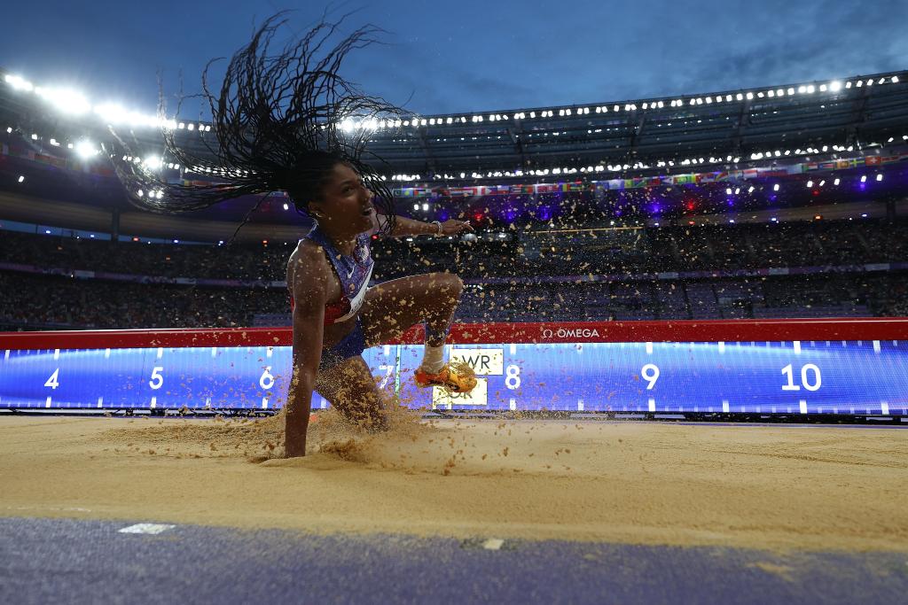 American Tara Davis-Woodhall continued her rapid ascent by winning gold in the women's long jump.
