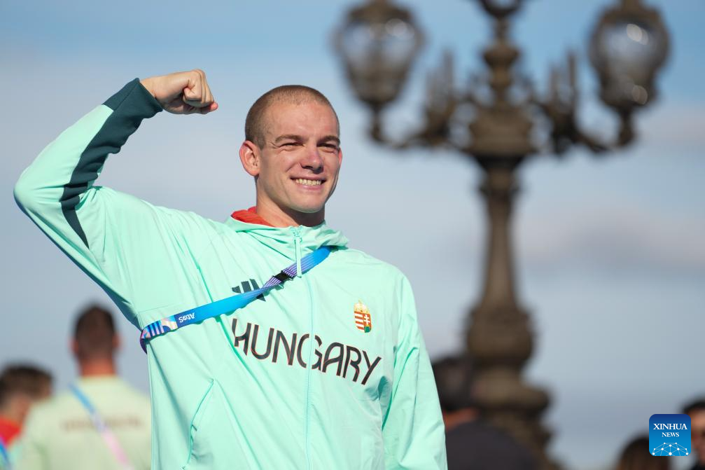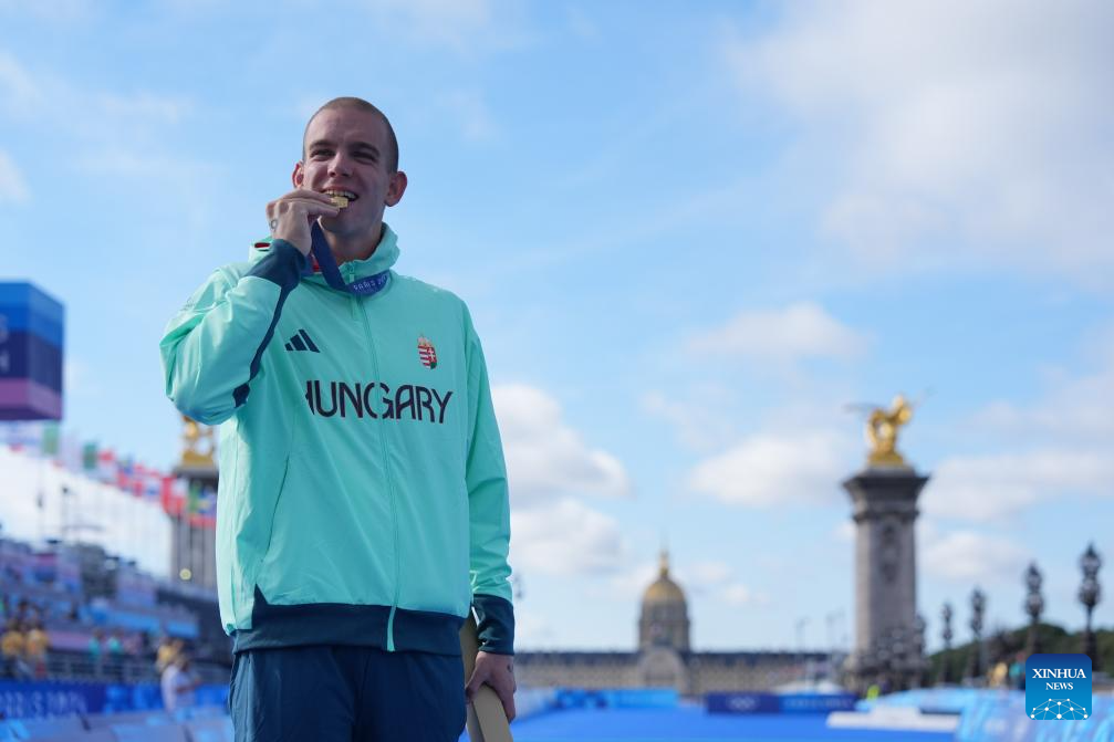 Gold medalist Kristof Rasovszky of Hungary celebrates after the awarding ceremony of the men's 10km of marathon swimming at the Paris 2024 Olympic Games in Paris, France, on Aug. 9, 2024. (Xinhua/Xue Yuge)
