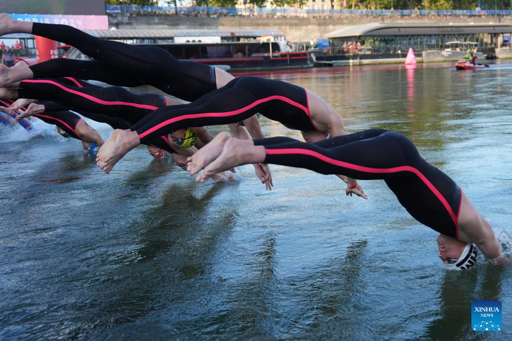 Athletes start during the men's 10km of marathon swimming at the Paris 2024 Olympic Games in Paris, France, on Aug. 9, 2024. (Xinhua/Xue Yuge)