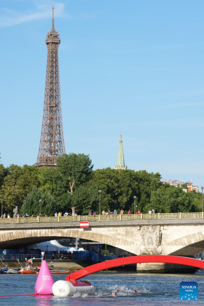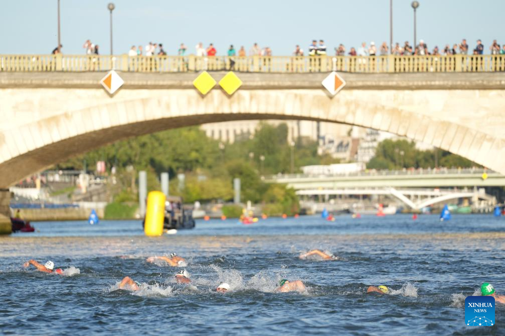 Athletes compete during the men's 10km of marathon swimming at the Paris 2024 Olympic Games in Paris, France, on Aug. 9, 2024. (Xinhua/Xue Yuge)