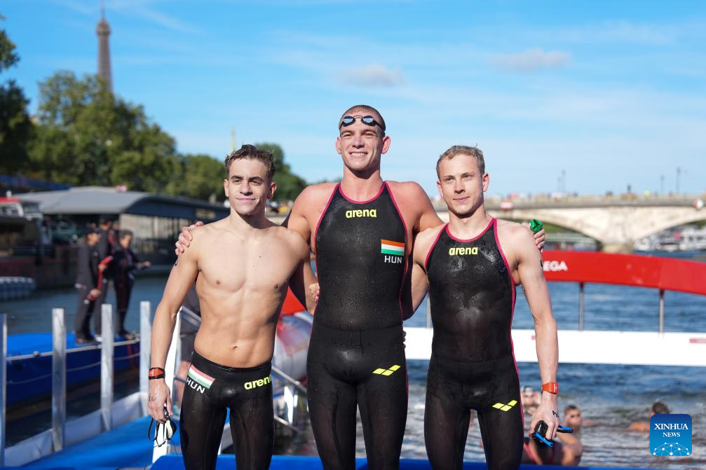 Kristof Rasovszky (C) of Hungary, Oliver Klemet (R) of Germany and David Betlehem of Hungary pose for photos after the men's 10km of marathon swimming at the Paris 2024 Olympic Games in Paris, France, on Aug. 9, 2024. (Xinhua/Xue Yuge)