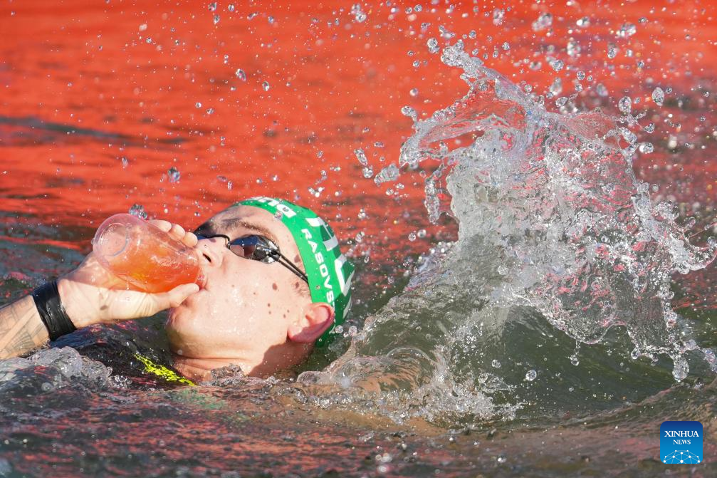 Kristof Rasovszky of Hungary takes a drink during the men's 10km of marathon swimming at the Paris 2024 Olympic Games in Paris, France, on Aug. 9, 2024. (Xinhua/Xue Yuge)
