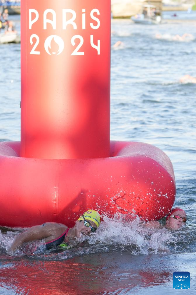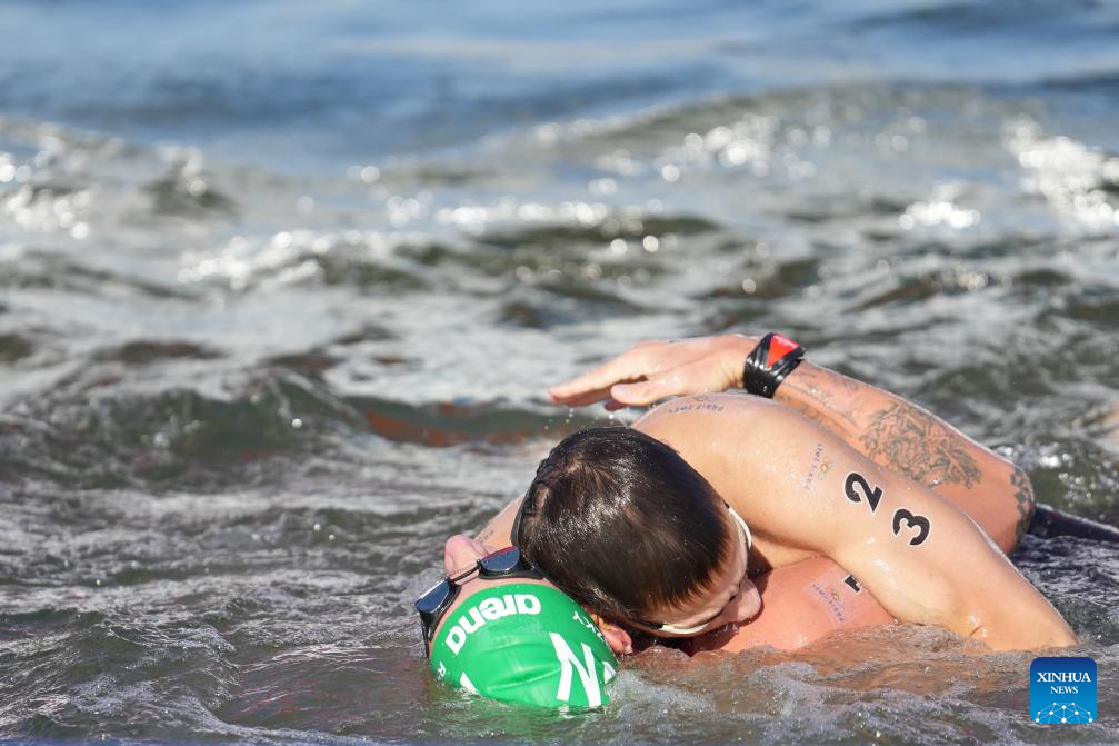David Betlehem (top R) of Hungary arrives at the finishing line during the men's 10km of marathon swimming at the Paris 2024 Olympic Games in Paris, France, on Aug. 9, 2024. (Xinhua/Xue Yuge)