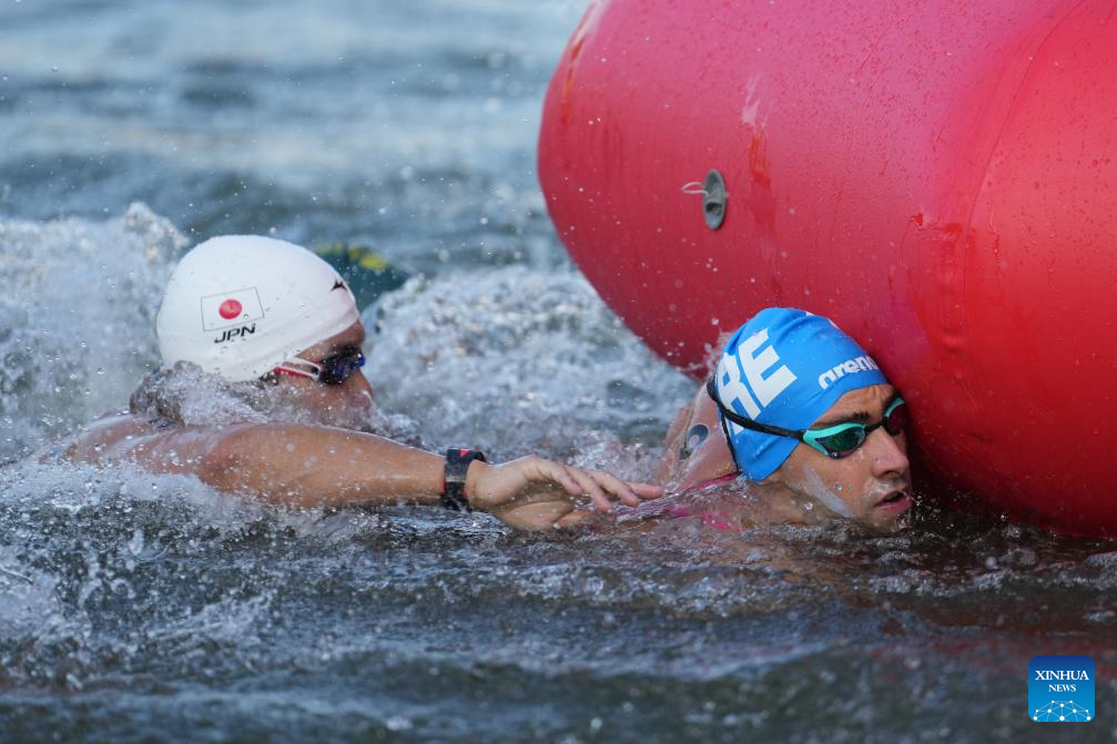 Athanasios Charalampos Kynigakis (R) of Greece and Minamide Taishin of Japan compete during the men's 10km of marathon swimming at the Paris 2024 Olympic Games in Paris, France, on Aug. 9, 2024. (Xinhua/Xue Yuge)