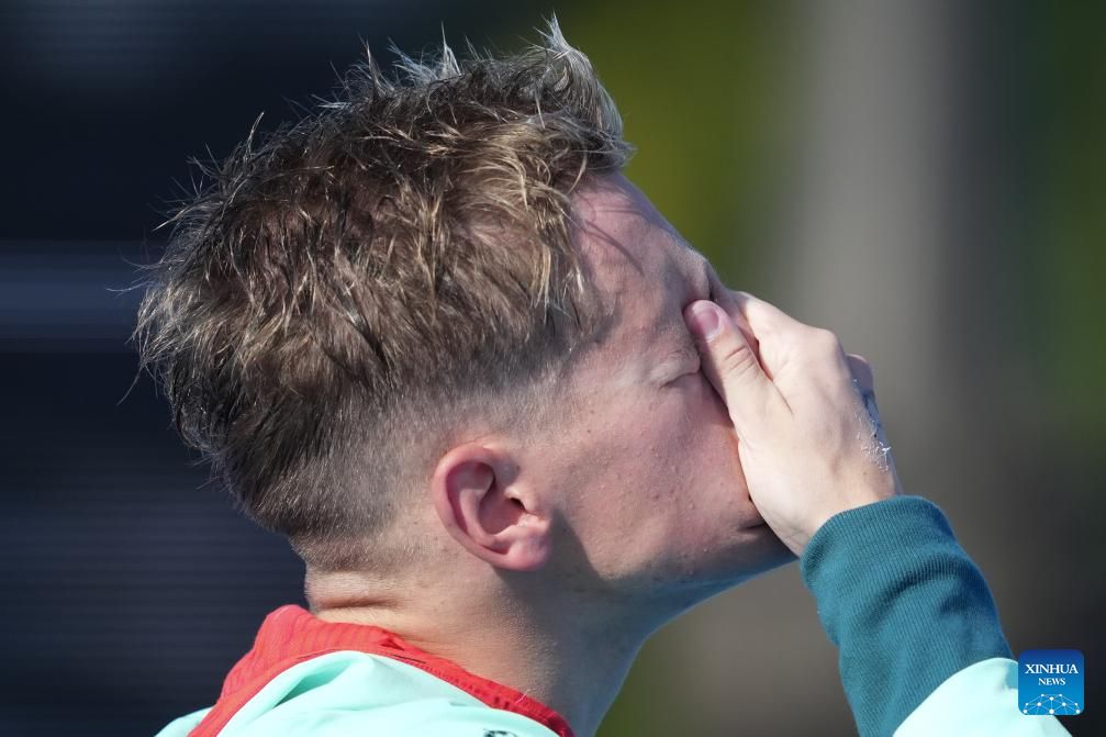 David Betlehem of Hungary reacts after the men's 10km of marathon swimming at the Paris 2024 Olympic Games in Paris, France, on Aug. 9, 2024. (Xinhua/Xue Yuge)