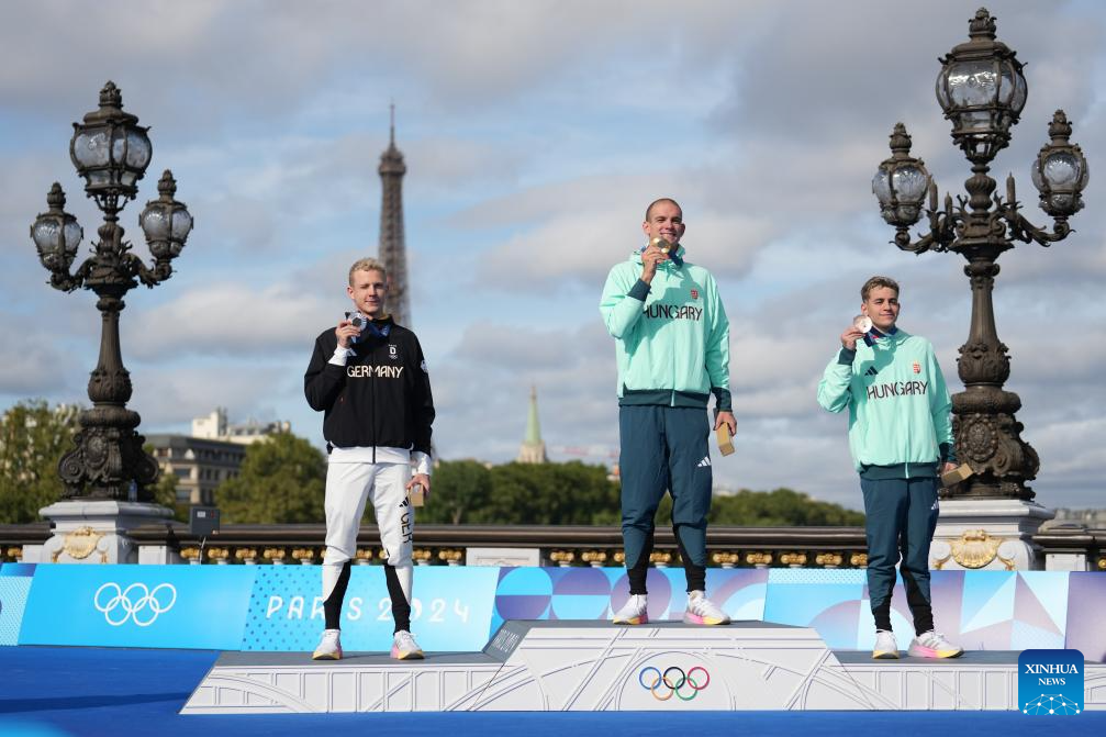 Gold medalist Kristof Rasovszky (C) of Hungary, silver medalist Oliver Klemet (L) of Germany and bronze medalist David Betlehem of Hungary attend the awarding ceremony after the men's 10km of marathon swimming at the Paris 2024 Olympic Games in Paris, France, on Aug. 9, 2024. (Xinhua/Xue Yuge)