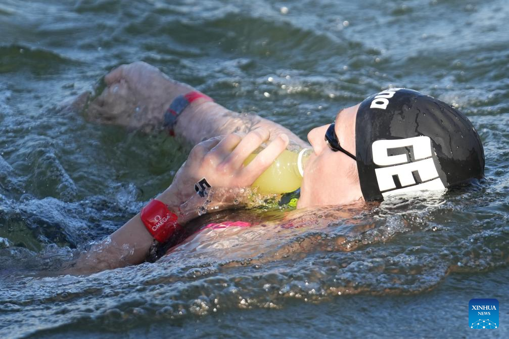 Florian Wellbrock of Germany takes a drink during the men's 10km of marathon swimming at the Paris 2024 Olympic Games in Paris, France, on Aug. 9, 2024. (Xinhua/Xue Yuge)