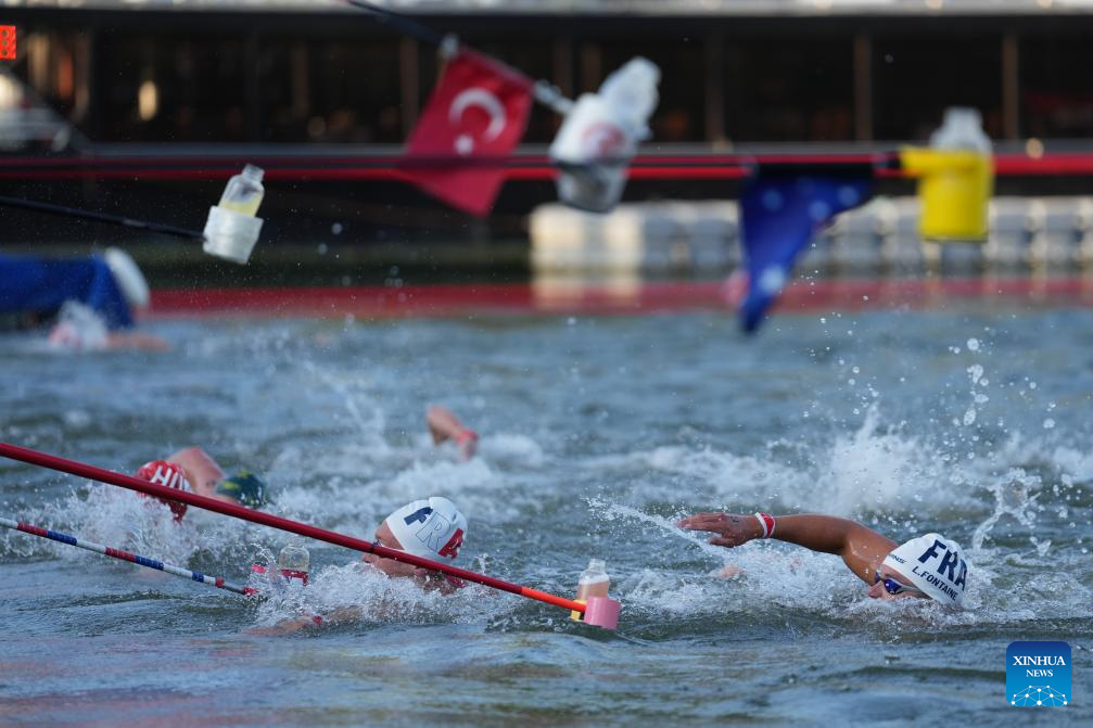 Athletes grab drinks during the men's 10km of marathon swimming at the Paris 2024 Olympic Games in Paris, France, on Aug. 9, 2024. (Xinhua/Xue Yuge)
