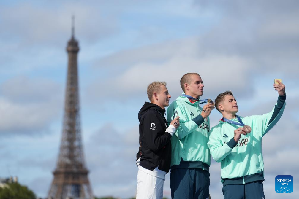 Gold medalist Kristof Rasovszky (C) of Hungary, silver medalist Oliver Klemet (L) of Germany and bronze medalist David Betlehem of Hungary pose for selfies during the awarding ceremony after the men's 10km of marathon swimming at the Paris 2024 Olympic Games in Paris, France, on Aug. 9, 2024. (Xinhua/Xue Yuge)