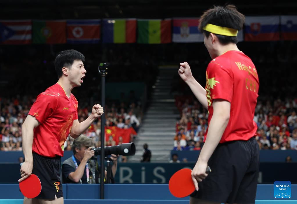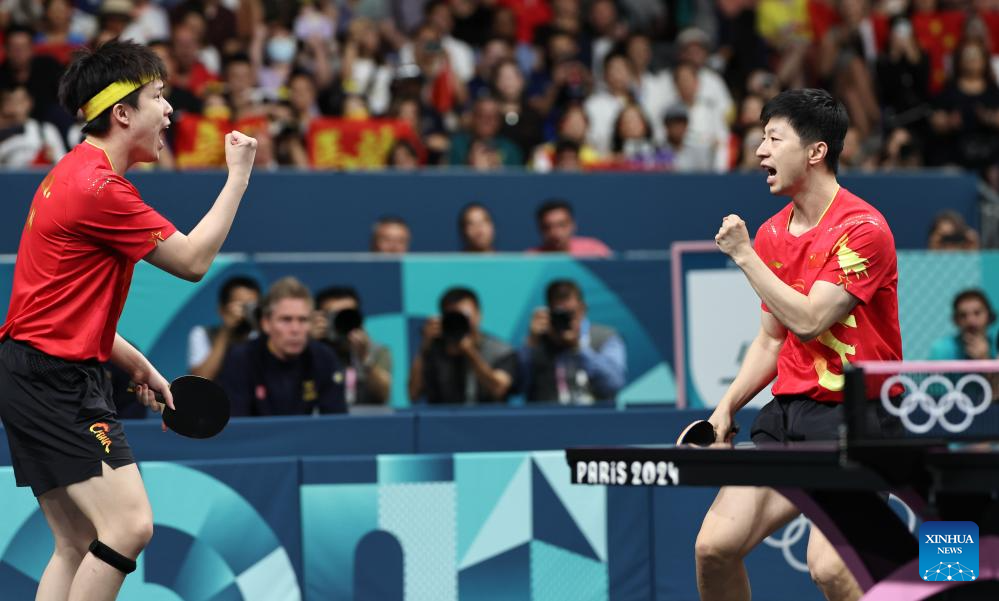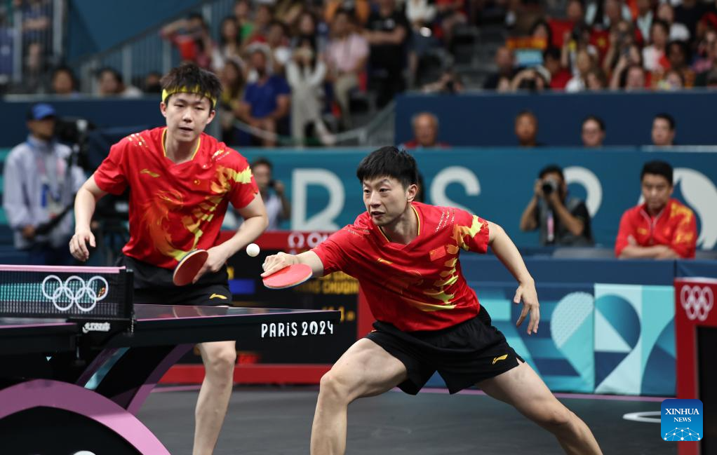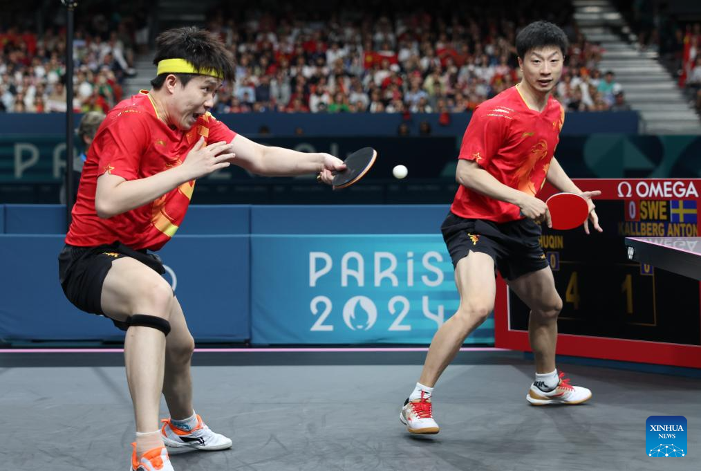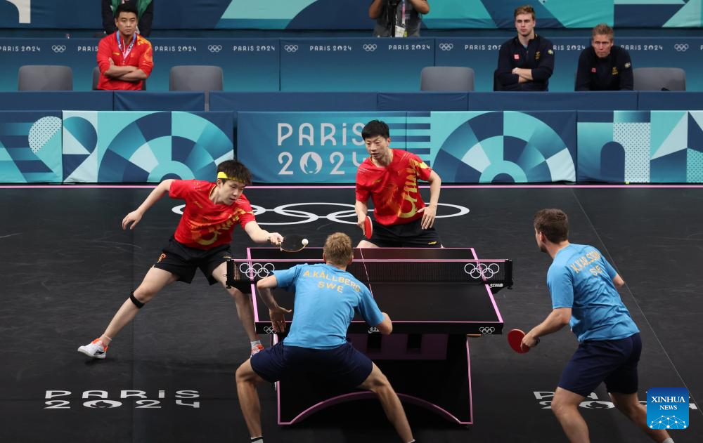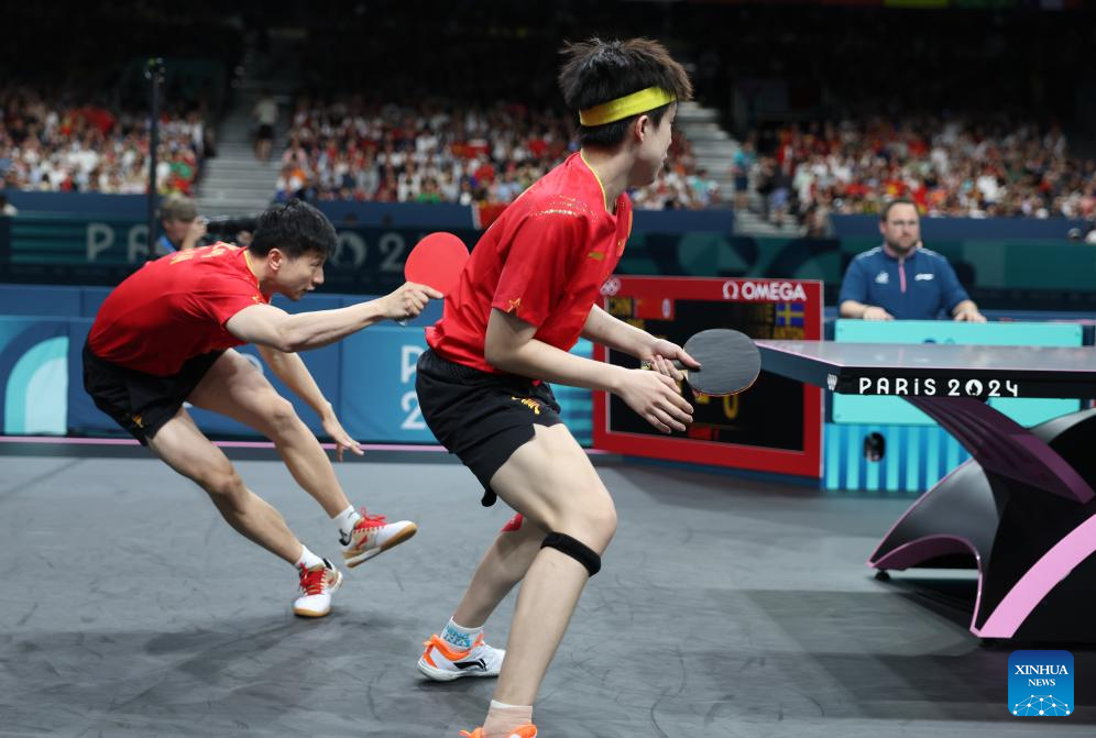 Ma Long/Wang Chuqin of China compete against Anton Kallberg/Kristian Karlsson of Sweden during the men's team gold medal match of table tennis between China and Sweden at the Paris 2024 Olympic Games in Paris, France, on Aug. 9, 2024. (Xinhua/Lai Xiangdong)