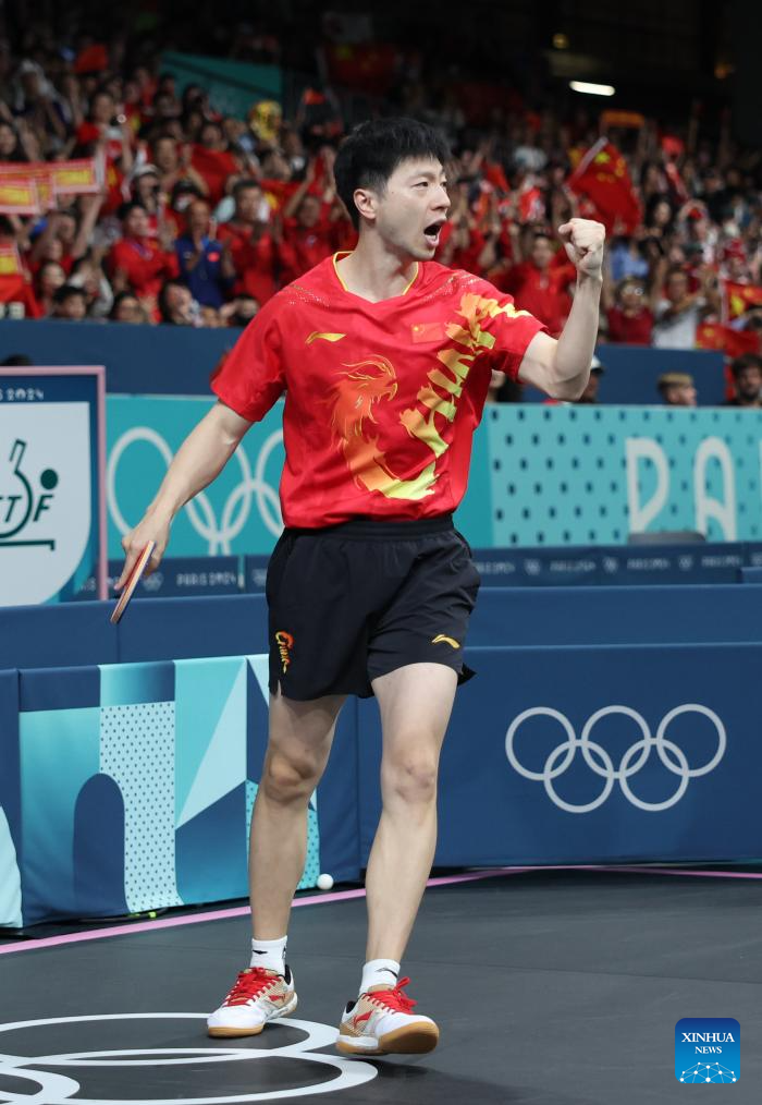 Ma Long of China reacts during the men's team gold medal match of table tennis between China and Sweden at the Paris 2024 Olympic Games in Paris, France, on Aug. 9, 2024. (Xinhua/Liu Xu)