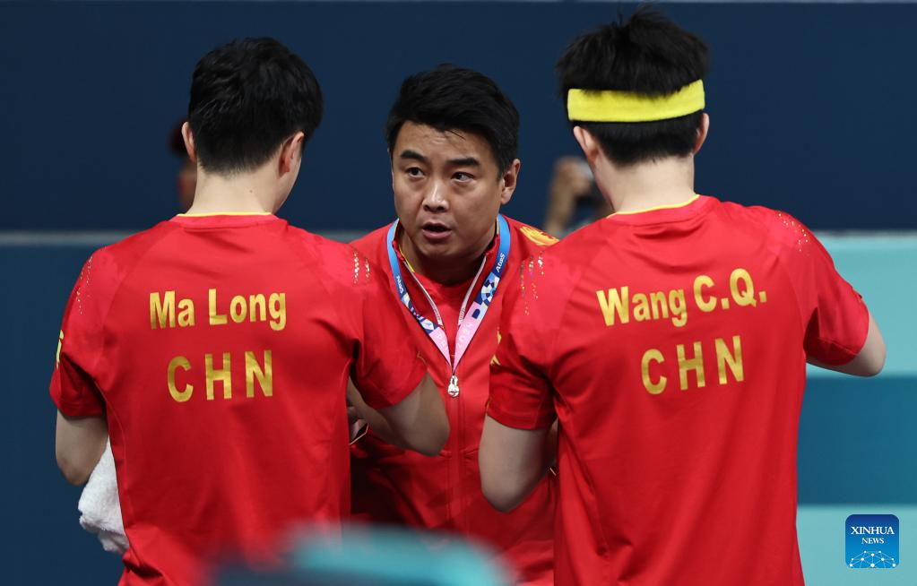 Coach Wang Hao (C) instructs Ma Long (L)/Wang Chuqin of China during the men's team gold medal match of table tennis between China and Sweden at the Paris 2024 Olympic Games in Paris, France, on Aug. 9, 2024. (Xinhua/Wang Dongzhen)