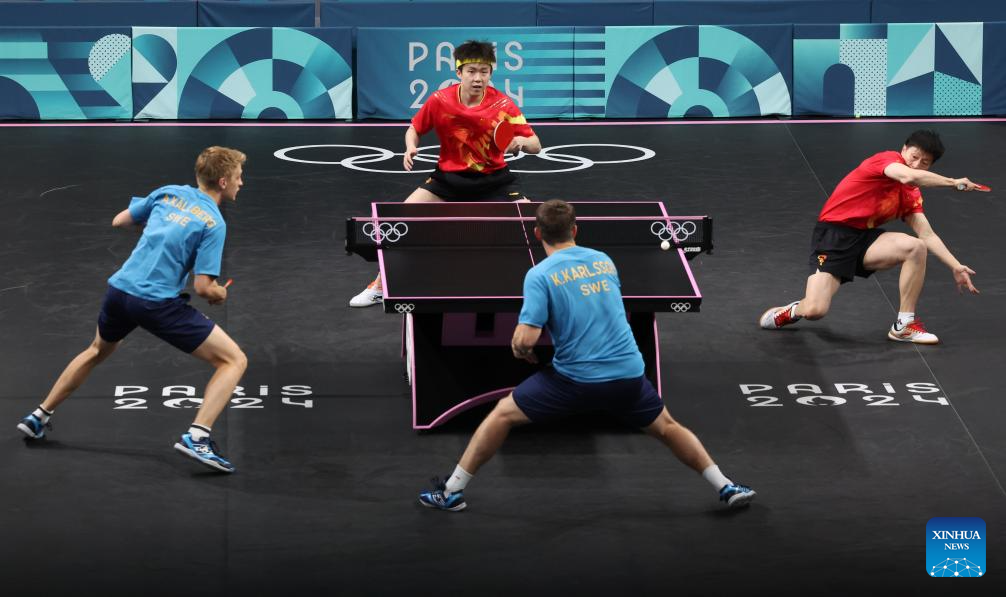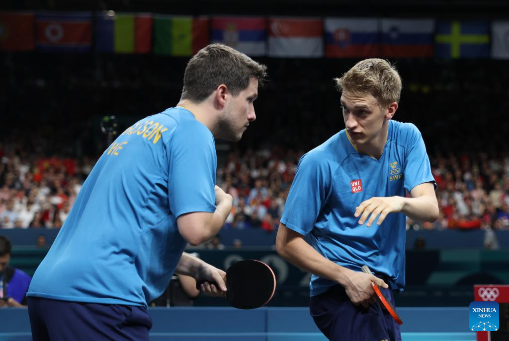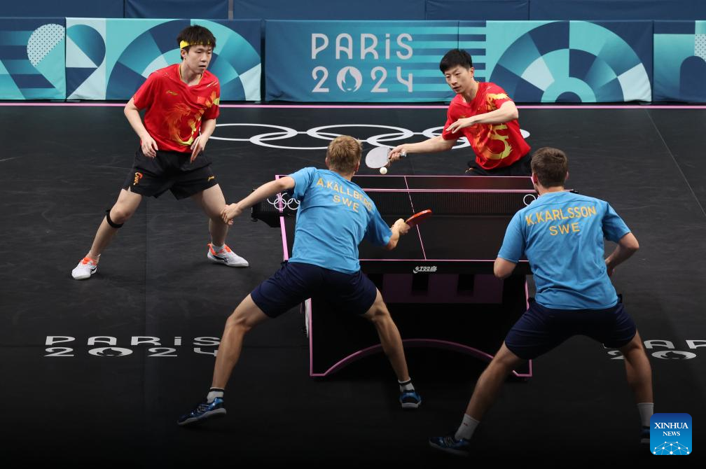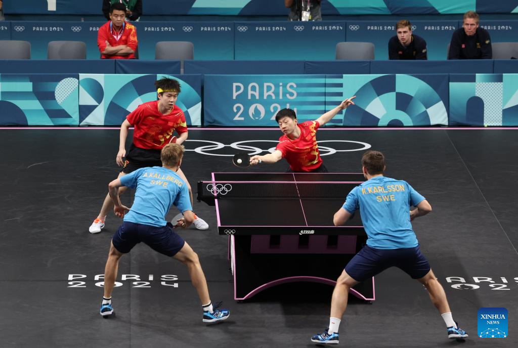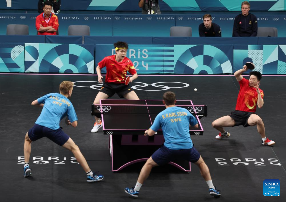 Anton Kallberg (R)/Kristian Karlsson of Sweden compete against Ma Long/Wang Chuqin of China during the men's team gold medal match of table tennis between China and Sweden at the Paris 2024 Olympic Games in Paris, France, on Aug. 9, 2024. (Xinhua/Liu Xu)