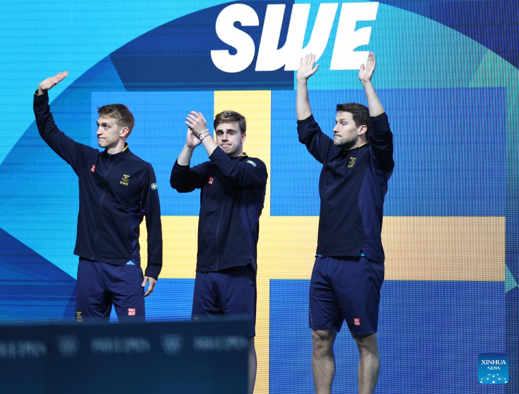 Team Sweden are seen prior to the men's team gold medal match of table tennis between China and Sweden at the Paris 2024 Olympic Games in Paris, France, on Aug. 9, 2024. (Xinhua/Wang Dongzhen)