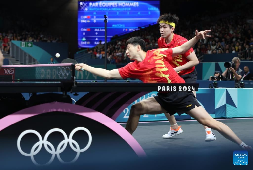 Ma Long (R top)/Wang Chuqin of China compete against Anton Kallberg/Kristian Karlsson of Sweden during the men's team gold medal match of table tennis between China and Sweden at the Paris 2024 Olympic Games in Paris, France, on Aug. 9, 2024. (Xinhua/Lai Xiangdong)