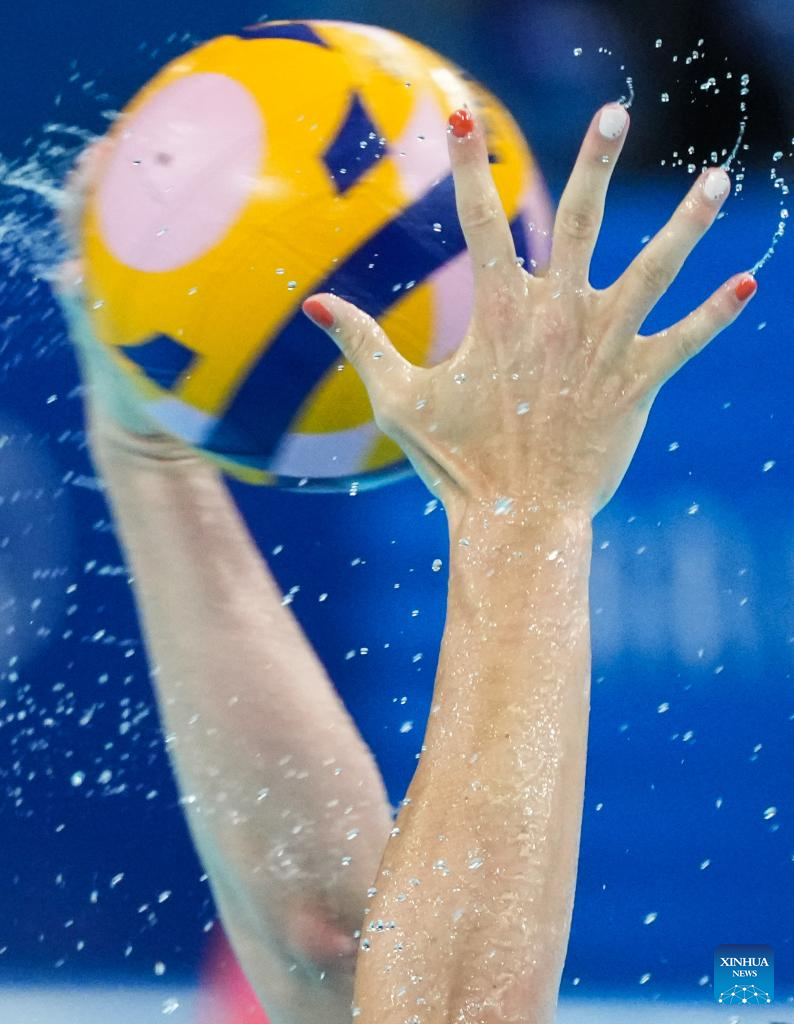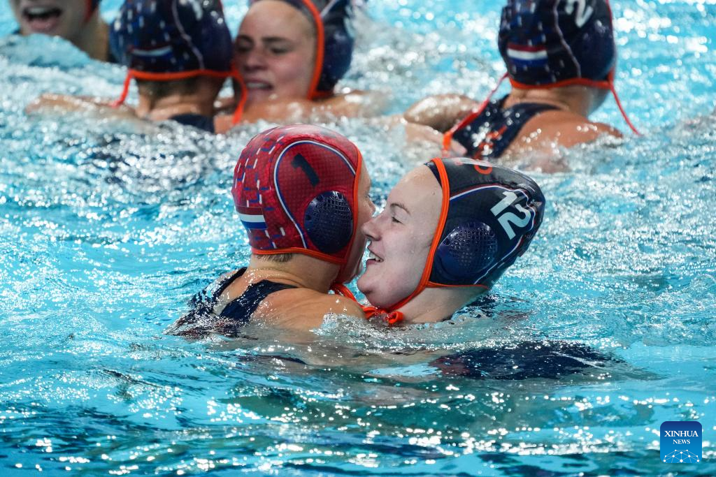 Athletes of team the Netherlands compete during the women's bronze medal match of water polo between the United States and the Netherlands at the Paris 2024 Olympic Games in Paris, France, on Aug. 10, 2024. (Xinhua/Du Yu)