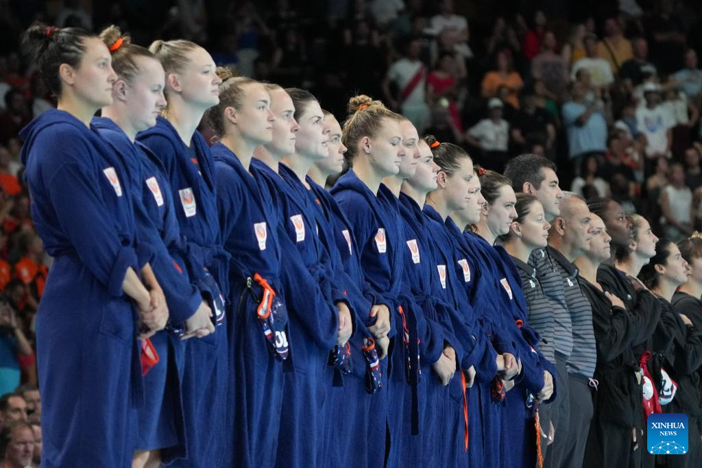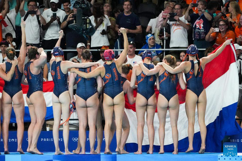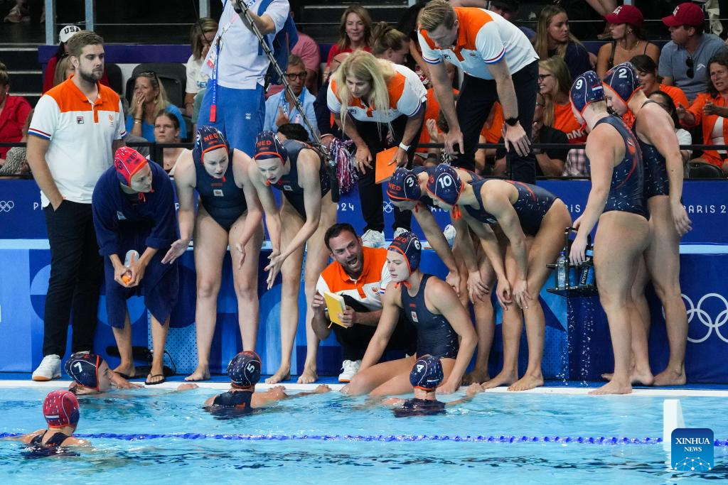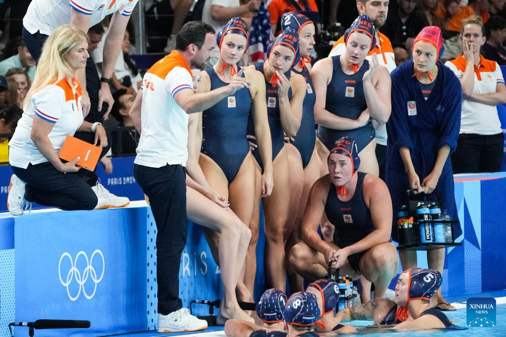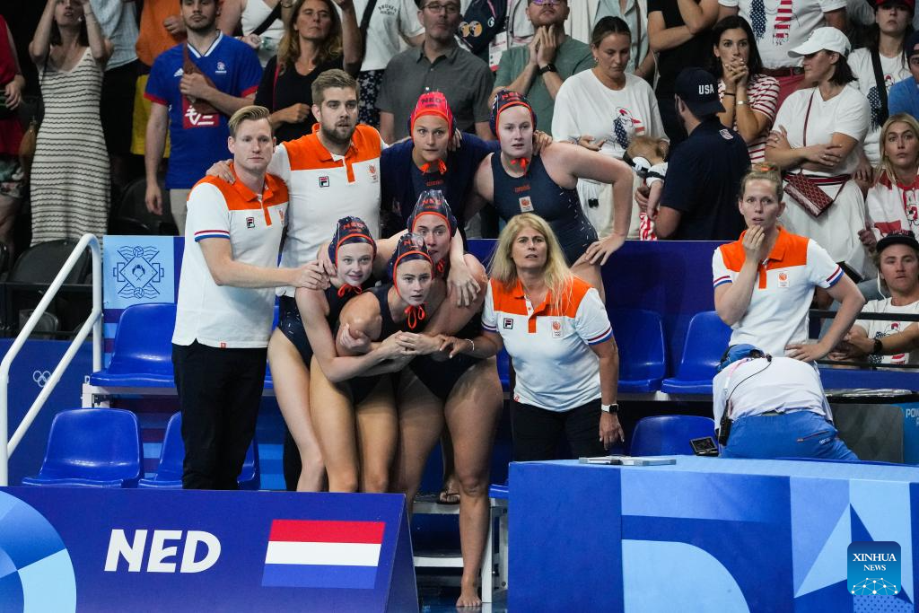 Athletes of team the Netherlands react before the women's bronze medal match of water polo between the United States and the Netherlands at the Paris 2024 Olympic Games in Paris, France, on Aug. 10, 2024. (Xinhua/Du Yu)