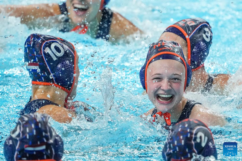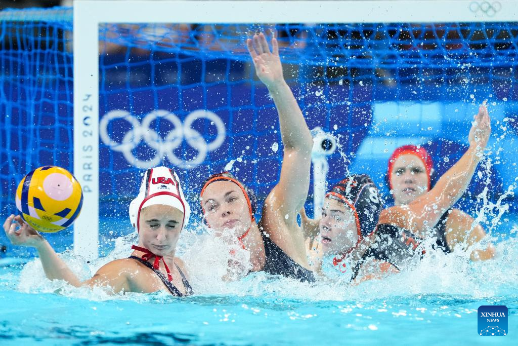 Maddie Musselman (L) of the United States competes during the women's bronze medal match of water polo between the United States and the Netherlands at the Paris 2024 Olympic Games in Paris, France, on Aug. 10, 2024. (Xinhua/Du Yu)
