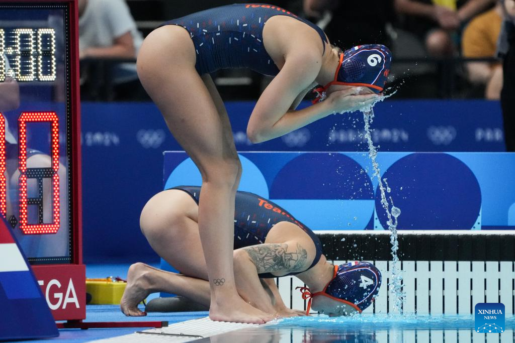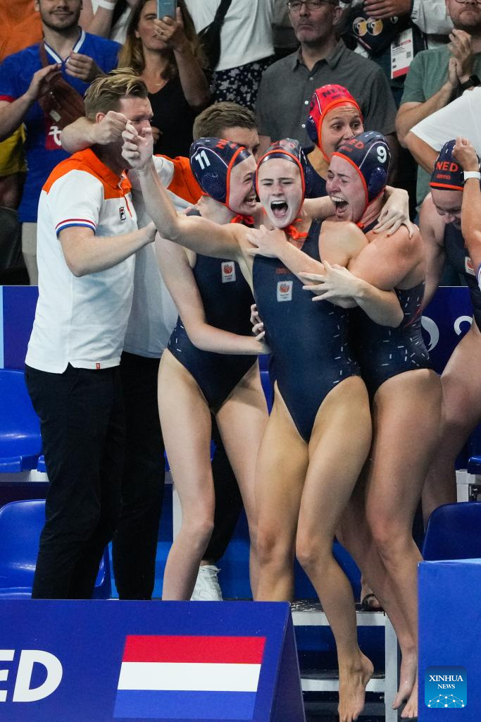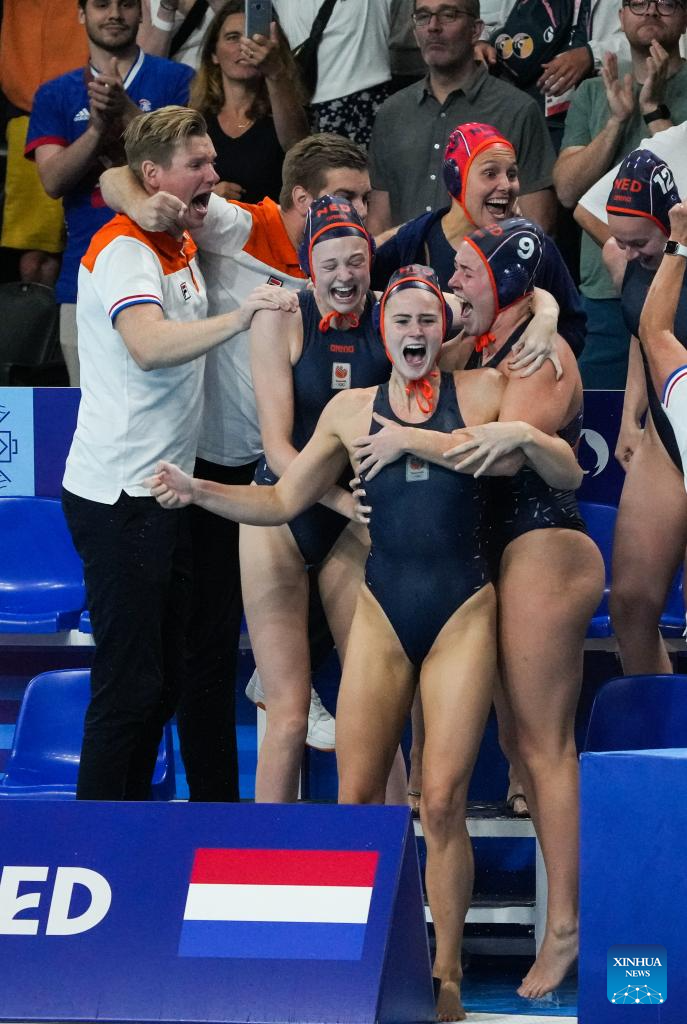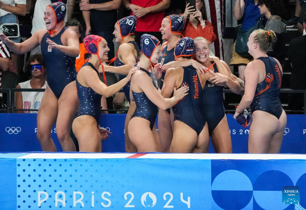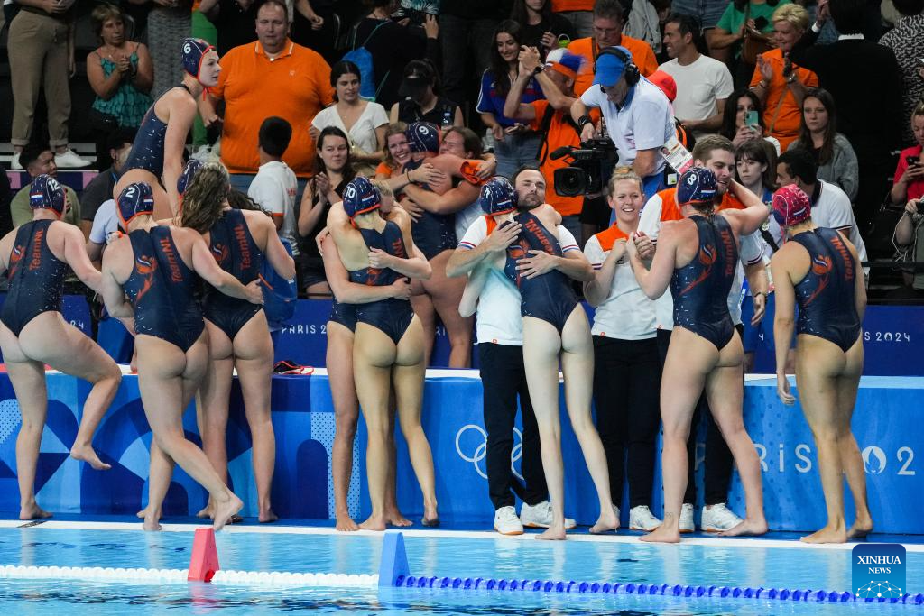 Athletes of team the Netherlands react during the women's bronze medal match of water polo between the United States and the Netherlands at the Paris 2024 Olympic Games in Paris, France, on Aug. 10, 2024. (Xinhua/Du Yu)