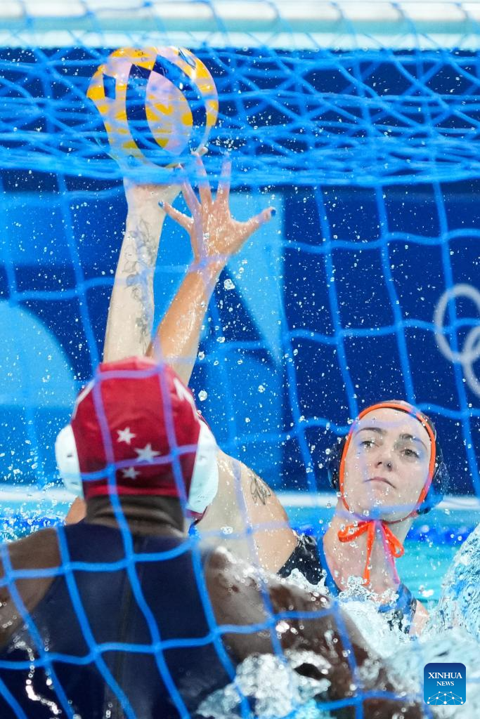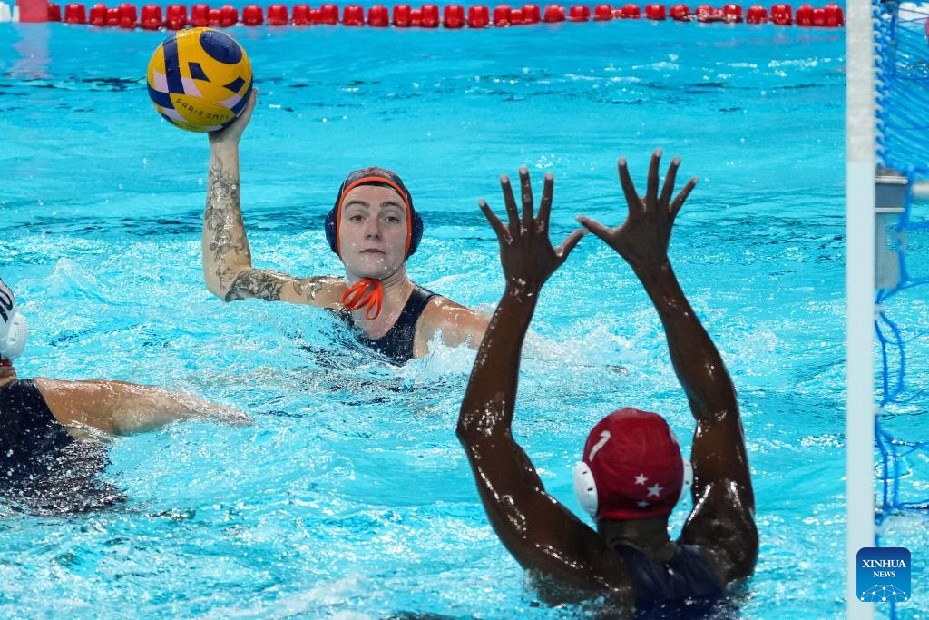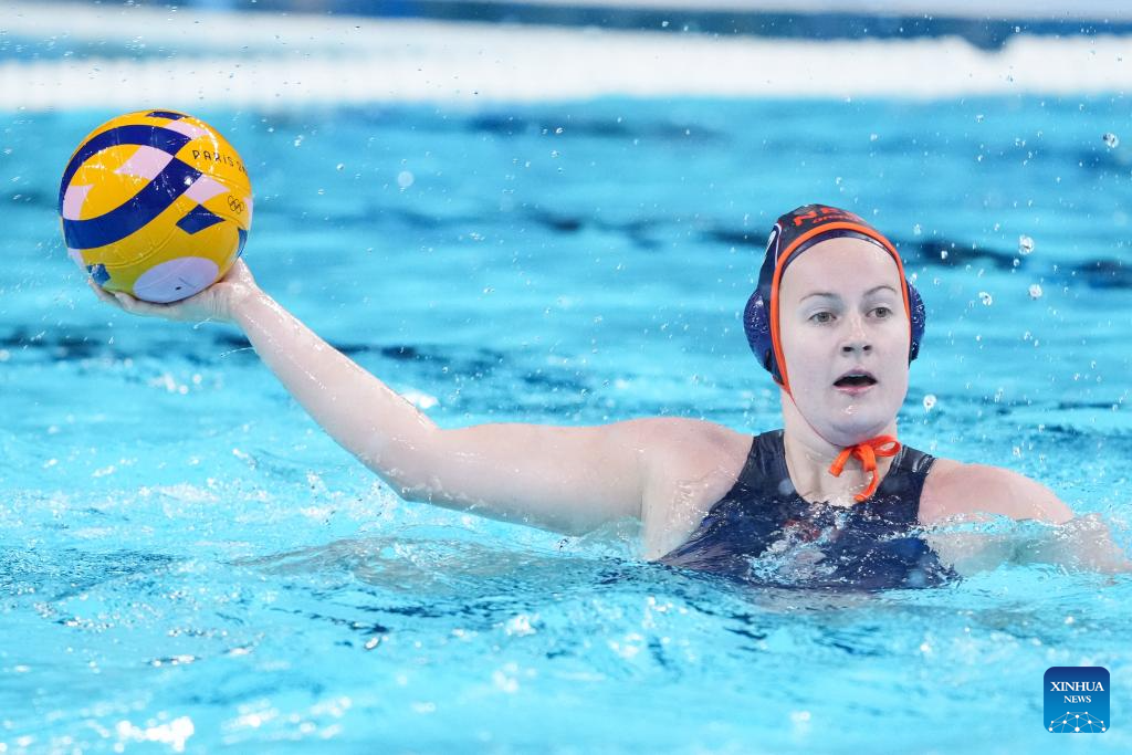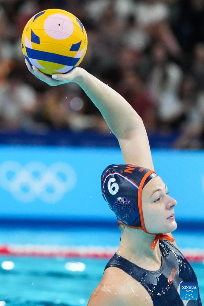 Simone van de Kraats of the Netherlands competes during the women's bronze medal match of water polo between the United States and the Netherlands at the Paris 2024 Olympic Games in Paris, France, on Aug. 10, 2024. (Xinhua/Du Yu)