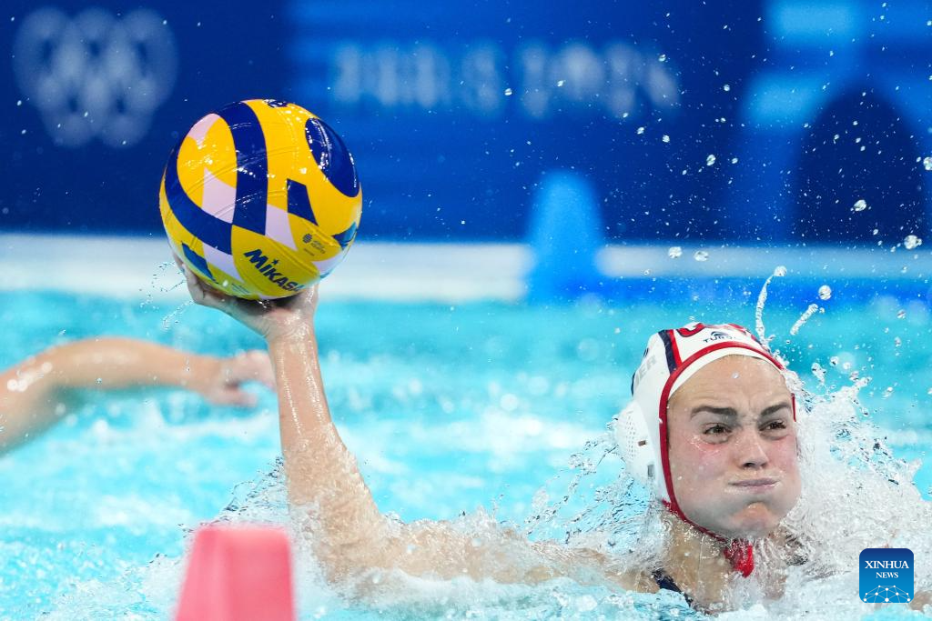 Jewel Roemer of the United States competes during the women's bronze medal match of water polo between the United States and the Netherlands at the Paris 2024 Olympic Games in Paris, France, on Aug. 10, 2024. (Xinhua/Du Yu)