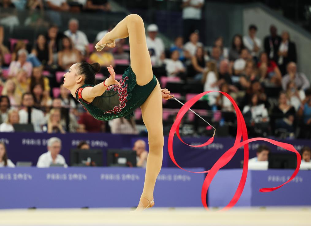 However, in the last rotation of ribbon, the Olympic debutant made errors and scored 29.300 points, finishing her competition with a total score of 131.550 at the Porte de La Chapelle Arena.