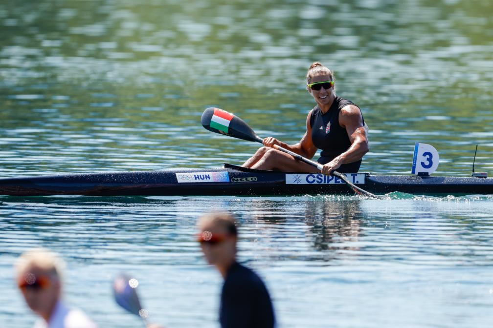 Tamara Csipes of Hungary reacts after the women's kayak single 500m final of canoe sprint at the Paris 2024 Olympic Games in Vaires-sur-Marne, France, on Aug. 10, 2024. (Xinhua/Shen Bohan)