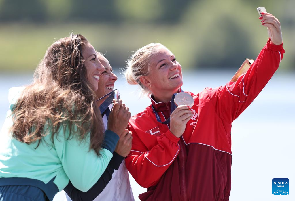 Gold medalist Lisa Carrington (C) of New Zealand, silver medalist Tamara Csipes (L) of Hungary and bronze medalist Emma Aastrand Jorgensen of Denmark take selfies during the awarding ceremony after the women's kayak single 500m final of canoe sprint at the Paris 2024 Olympic Games in Vaires-sur-Marne, France, on Aug. 10, 2024. (Xinhua/Ren Pengfei)