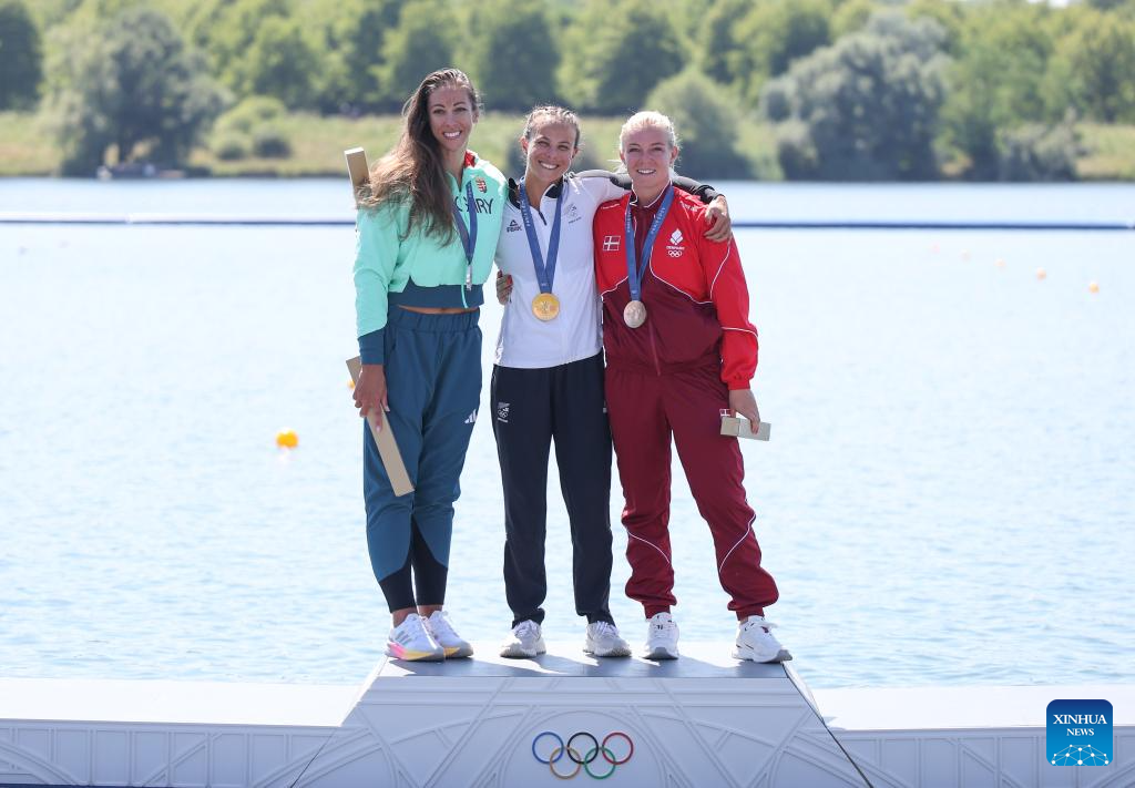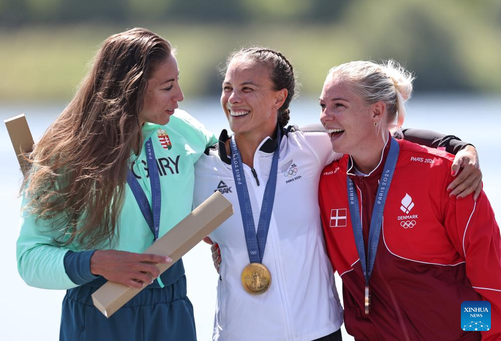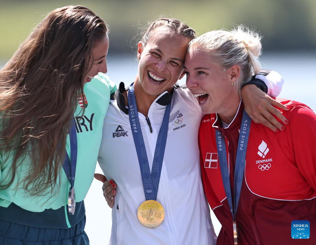 Gold medalist Lisa Carrington (C) of New Zealand, silver medalist Tamara Csipes (L) of Hungary and bronze medalist Emma Aastrand Jorgensen of Denmark attend the awarding ceremony after the women's kayak single 500m final of canoe sprint at the Paris 2024 Olympic Games in Vaires-sur-Marne, France, on Aug. 10, 2024. (Xinhua/Ren Pengfei)