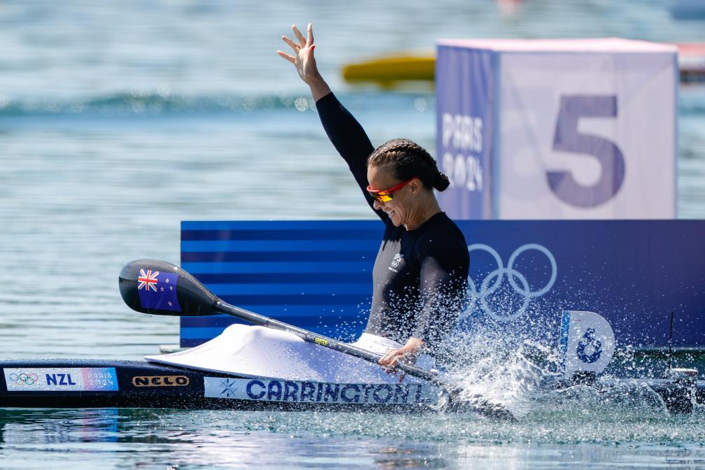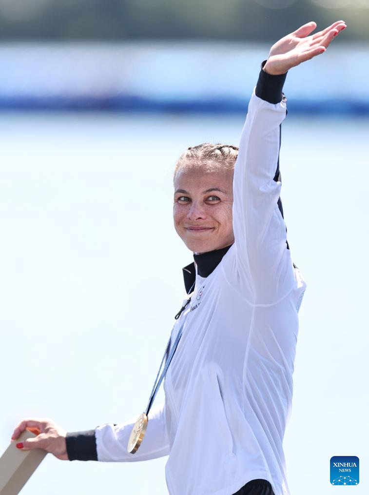 Gold medalist Lisa Carrington of New Zealand waves to spectators after the awarding ceremony of the women's kayak single 500m final of canoe sprint at the Paris 2024 Olympic Games in Vaires-sur-Marne, France, on Aug. 10, 2024. (Xinhua/Ren Pengfei)