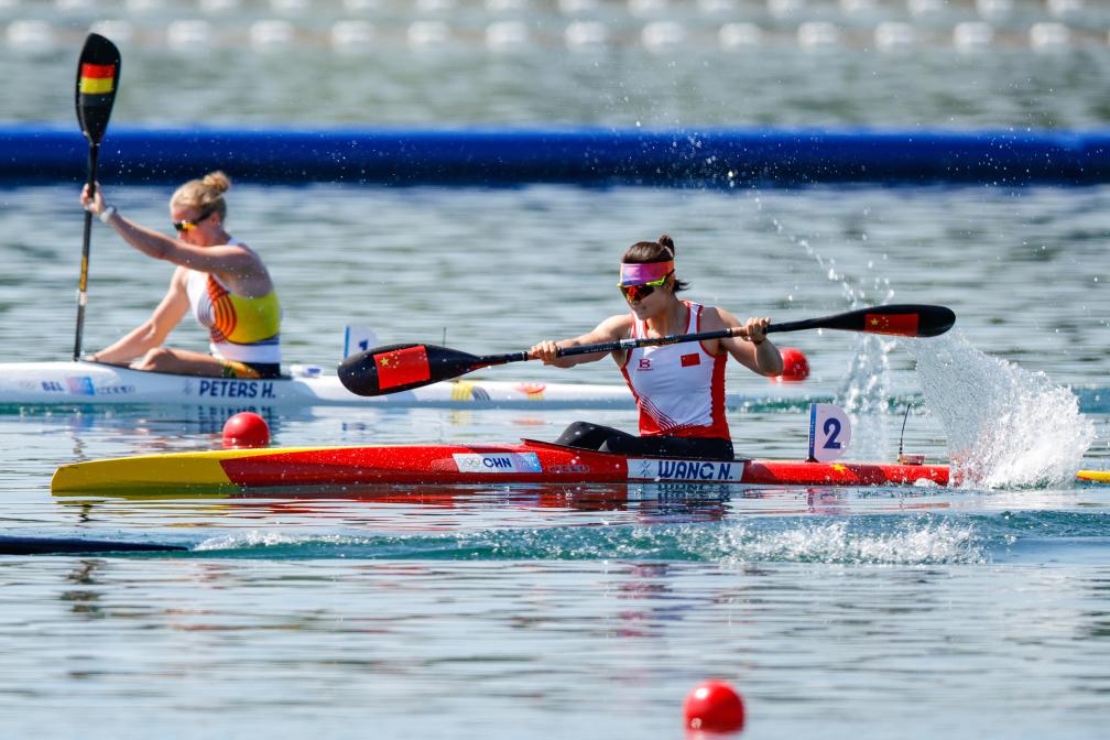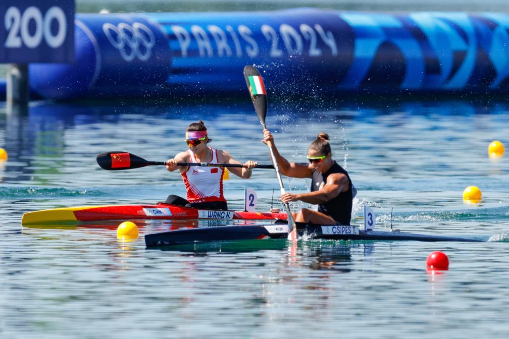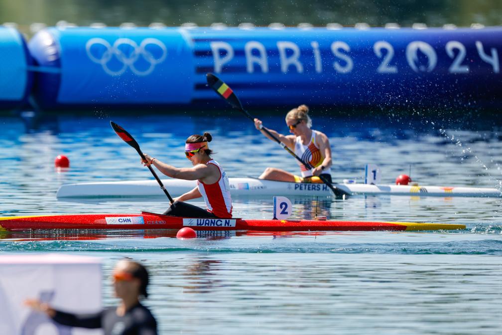 Wang Nan (L) of China competes during the women's kayak single 500m final of canoe sprint at the Paris 2024 Olympic Games in Vaires-sur-Marne, France, on Aug. 10, 2024. (Xinhua/Shen Bohan)