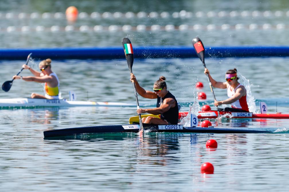 Tamara Csipes (front) of Hungary competes during the women's kayak single 500m final of canoe sprint at the Paris 2024 Olympic Games in Vaires-sur-Marne, France, on Aug. 10, 2024. (Xinhua/Shen Bohan)