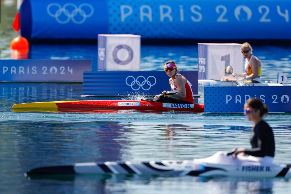 Wang Nan (C) of China competes during the women's kayak single 500m final of canoe sprint at the Paris 2024 Olympic Games in Vaires-sur-Marne, France, on Aug. 10, 2024. (Xinhua/Shen Bohan)