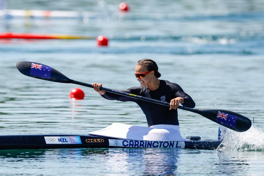 Lisa Carrington of New Zealand competes during the women's kayak single 500m final of canoe sprint at the Paris 2024 Olympic Games in Vaires-sur-Marne, France, on Aug. 10, 2024. (Xinhua/Shen Bohan)