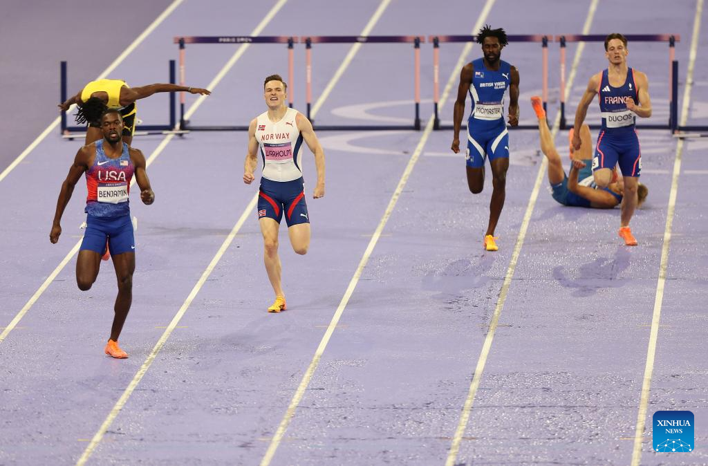 Rai Benjamin (2nd L) of the United States, Karsten Warholm (2nd R) of Norway compete during the men's 400m hurdles final of Athletics at the Paris 2024 Olympic Games in Paris, France, Aug. 9, 2024. (Xinhua/Li Ying)