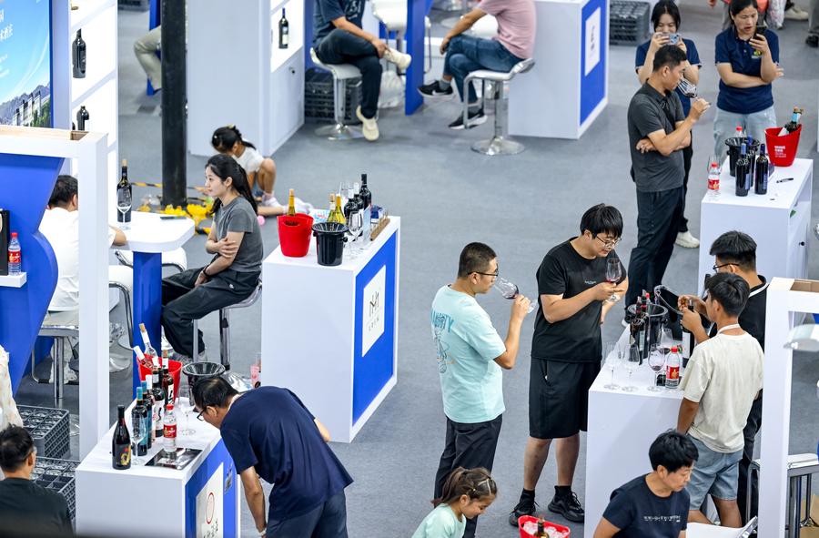 Visitors learn about wines at the Helan Mountain's east foothill international wine fair in Yinchuan, northwest China's Ningxia Hui Autonomous Region, Aug. 10, 2024. (Xinhua/Feng Kaihua)