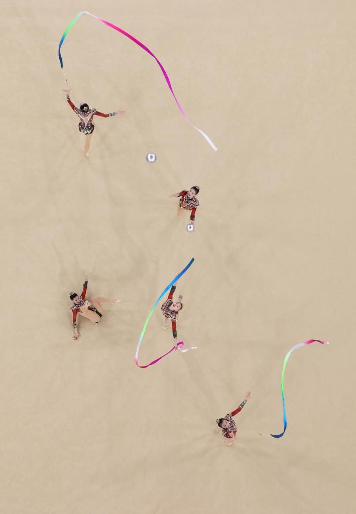 China scored a total of 69.800 points in the two rotations, 36.950 in five hoops and 32.850 in three ribbons plus two balls during the group all-around final at the Porte de La Chapelle Arena, securing the first place among eight teams.