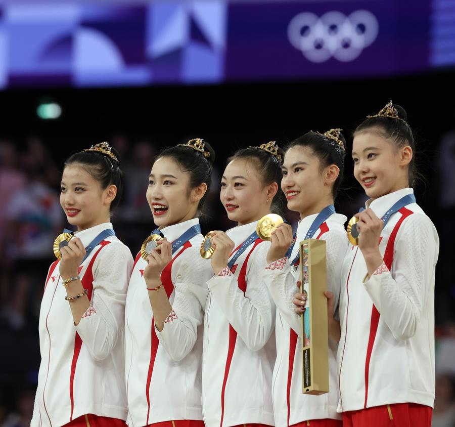 Team China attend the awarding ceremony after the group all-round final of rhythmic gymnastics at the Paris 2024 Olympic Games in Paris, France, Aug. 10, 2024. (Xinhua/Xu Yanan)