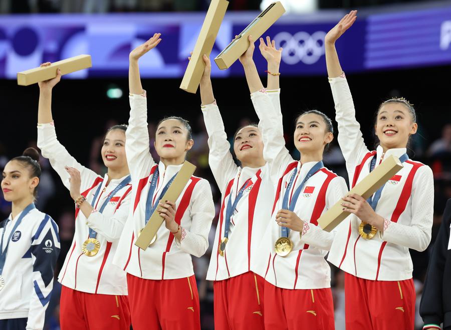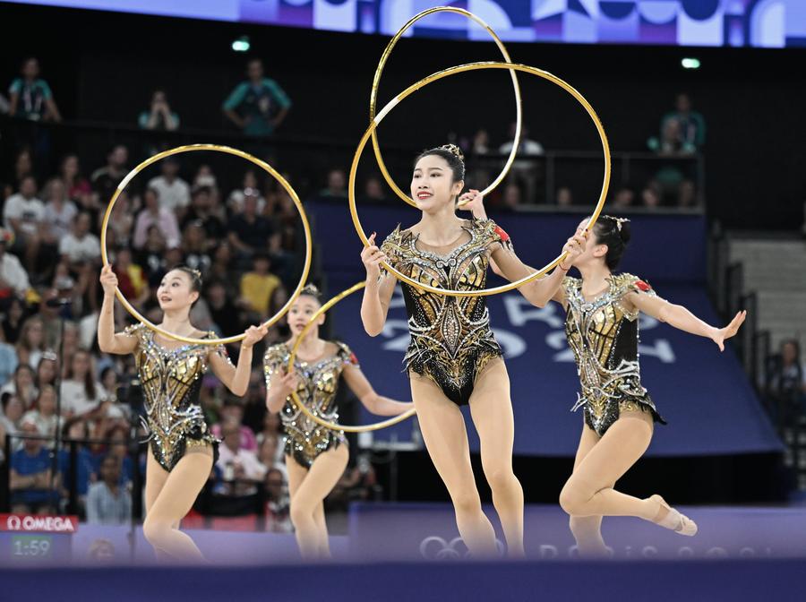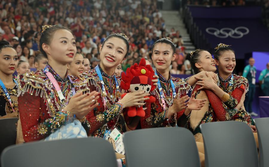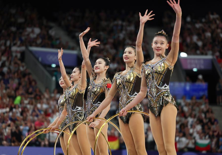 Team China attend the awarding ceremony after the group all-round final of rhythmic gymnastics at the Paris 2024 Olympic Games in Paris, France, Aug. 10, 2024. (Xinhua/Xu Yanan)Athletes of Team China compete during the group all-round final of rhythmic gymnastics at the Paris 2024 Olympic Games in Paris, France, Aug. 10, 2024. (Xinhua/Guo Yu)