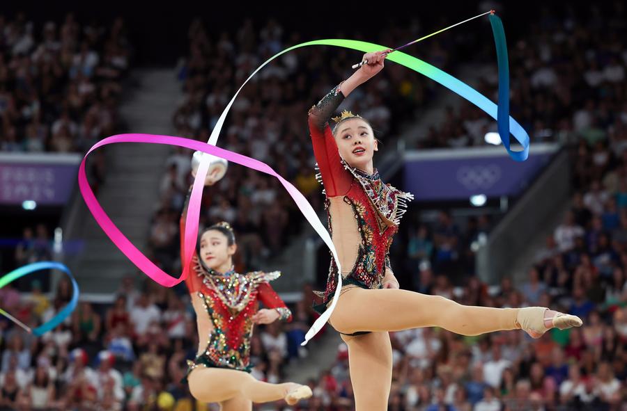 Athletes of Team China compete during the group all-round final of rhythmic gymnastics at the Paris 2024 Olympic Games in Paris, France, Aug. 10, 2024. (Xinhua/Xu Yanan)Athletes of Team China compete during the group all-round final of rhythmic gymnastics at the Paris 2024 Olympic Games in Paris, France, Aug. 10, 2024. (Xinhua/Xu Yanan)Athletes of China compete during group all-round final of rhythmic gymnastics at the Paris 2024 Olympic Games in Paris, France, Aug. 10, 2024. (Xinhua/Cheng Min)Athletes of Team China compete during group all-round final of rhythmic gymnastics at the Paris 2024 Olympic Games in Paris, France, Aug. 10, 2024. (Xinhua/Cheng Min)