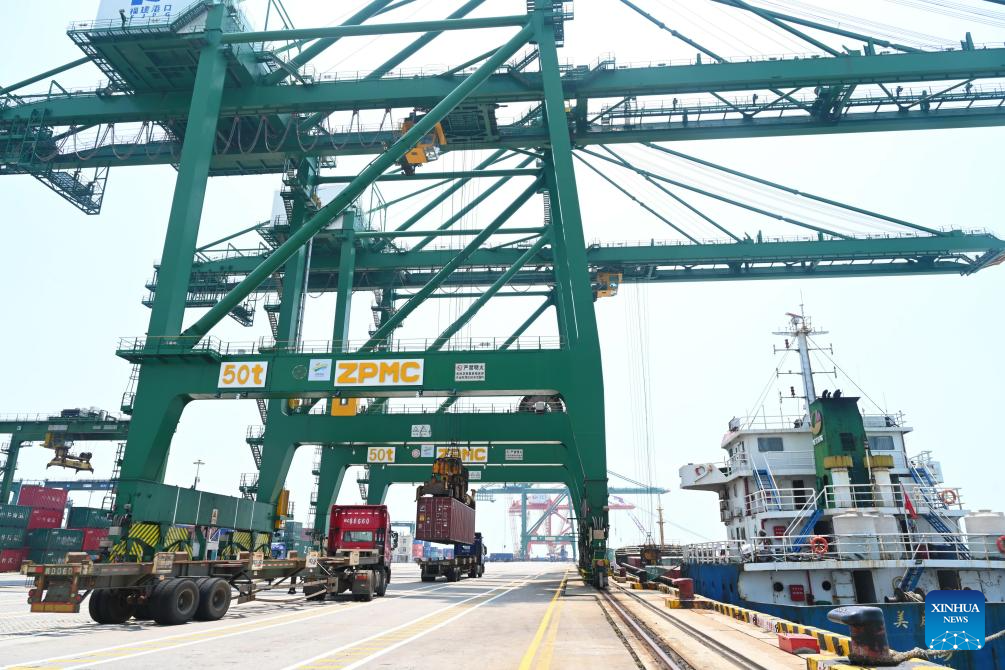 This photo taken on Aug. 8, 2024 shows a dock capable of an automatic loading and unloading at Fuzhou port in Fuzhou, southeast China's Fujian Province. In recent years, Fujian Province has attached importance to the construction and development of its coastal ports, with their operation efficiency improved, service upgraded, and economic zones enlarged.