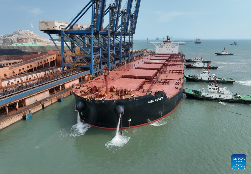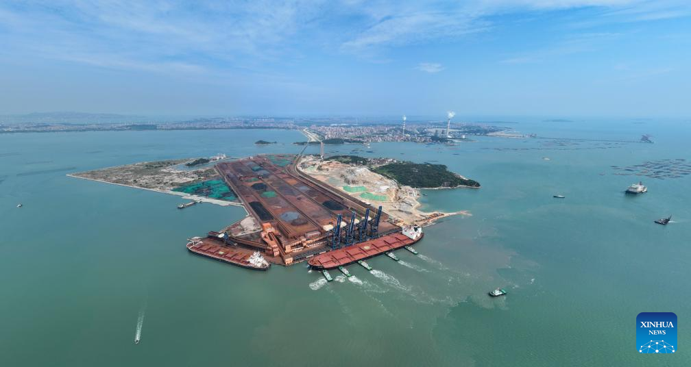 A drone photo taken on Aug. 7, 2024 shows an iron ore cargo ship from Brazil docking at a port of the Meizhou Bay of Putian City, southeast China's Fujian Province. In recent years, Fujian Province has attached importance to the construction and development of its coastal ports, with their operation efficiency improved, service upgraded, and economic zones enlarged.