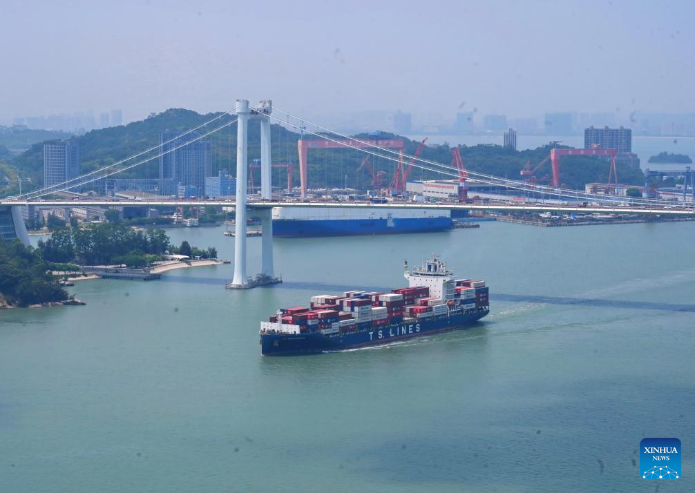 A cargo ship departing from the Xiamen port passes the Haicang Bridge in Xiamen, southeast China's Fujian Province, Aug. 6, 2024. In recent years, Fujian Province has attached importance to the construction and development of its coastal ports, with their operation efficiency improved, service upgraded, and economic zones enlarged.