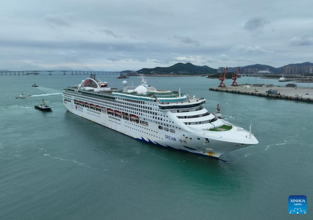 A drone photo taken on March 6, 2024 shows an international cruise ship departing a dock in Pingtan, southeast China's Fujian Province. In recent years, Fujian Province has attached importance to the construction and development of its coastal ports, with their operation efficiency improved, service upgraded, and economic zones enlarged.