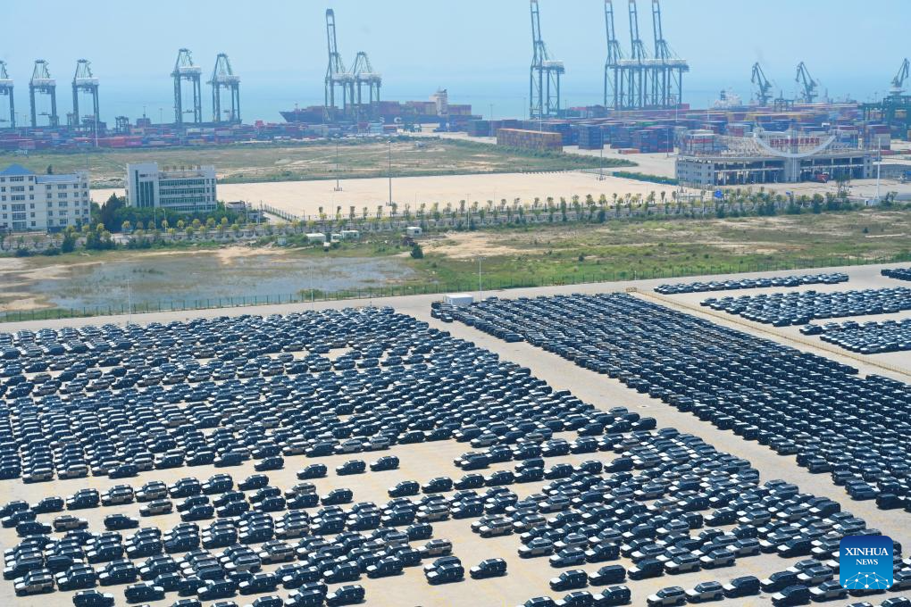 Motor vehicles for export wait to be loaded at the Fuzhou port in Fuzhou, southeast China's Fujian Province, Aug. 8, 2024. In recent years, Fujian Province has attached importance to the construction and development of its coastal ports, with their operation efficiency improved, service upgraded, and economic zones enlarged.