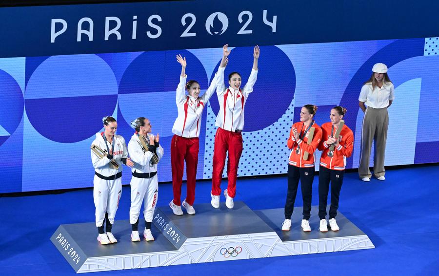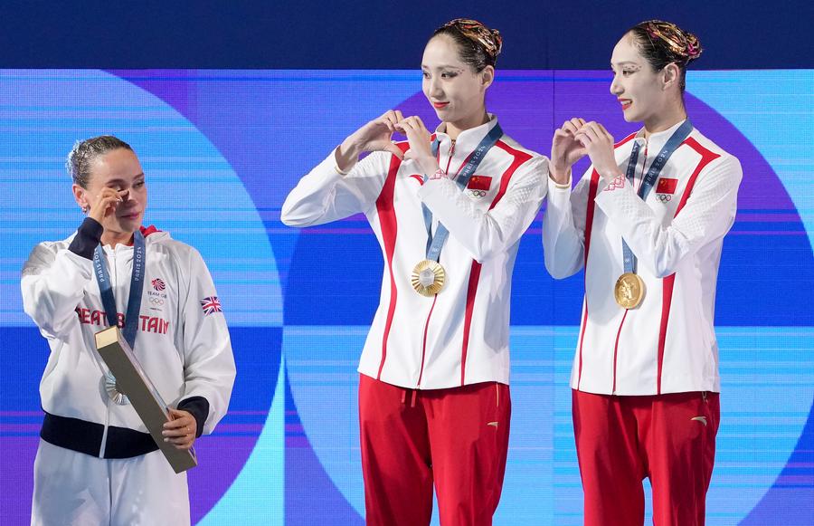 Gold medalists Wang Liuyi/Wang Qianyi of China make heart-shaped hand gestures during the victory ceremony for the duet free routine of artistic swimming at the Paris 2024 Olympic Games in Saint-Denis, France, Aug. 10, 2024. (Xinhua/Xue Yuge)Gold medalists Wang Liuyi/Wang Qianyi (C) of China, silver medalists Kate Shortman/Isabelle Thorpe (L) of Britain and bronze medalists Bregje de Brouwer/Noortje de Brouwer of the Netherlands attend the victory ceremony for the duet free routine of artistic swimming at the Paris 2024 Olympic Games in Saint-Denis, France, Aug. 10, 2024. (Xinhua/Xia Yifang)Wang Liuyi/Wang Qianyi of China compete during the duet free routine of artistic swimming at the Paris 2024 Olympic Games in Saint-Denis, France, Aug. 10, 2024. (Xinhua/Xia Yifang)Wang Liuyi/Wang Qianyi of China compete during the duet free routine of artistic swimming at the Paris 2024 Olympic Games in Saint-Denis, France, Aug. 10, 2024. (Xinhua/Xia Yifang)Wang Liuyi/Wang Qianyi of China compete during the duet free routine of artistic swimming at the Paris 2024 Olympic Games in Saint-Denis, France, Aug. 10, 2024. (Xinhua/Xue Yuge)■