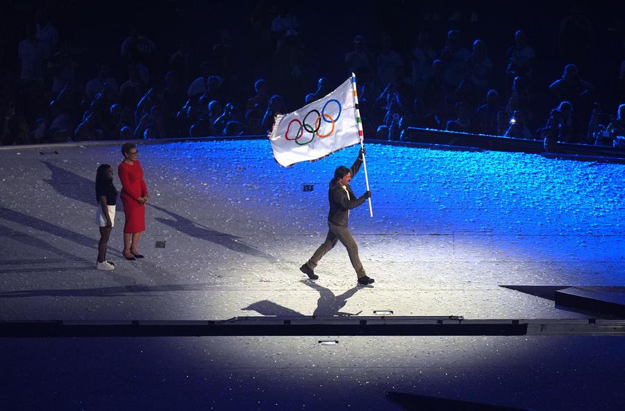 The live events in the stadium concluded with film star Tom Cruise repelling down from the roof of the Stade de France taking the Olympic flag out of the stadium on a motorcycle, before transitioning to a plane and delivering the flag to Los Angeles.