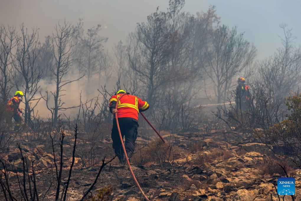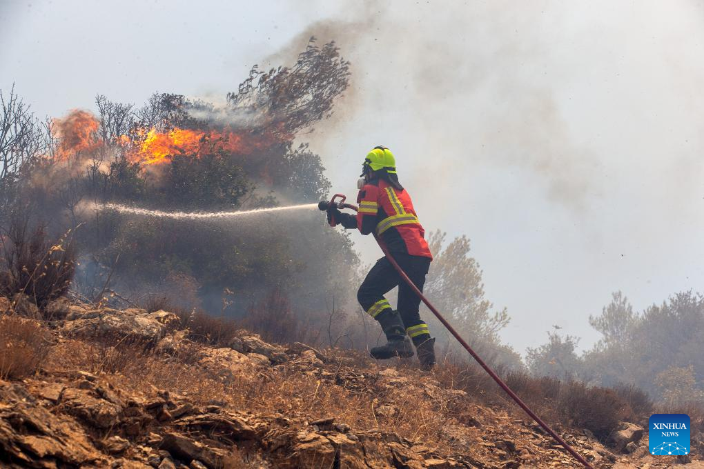 Firefighters try to extinguish a wildfire in Attica, Greece, on Aug. 12, 2024. (Xinhua/Marios Lolos)