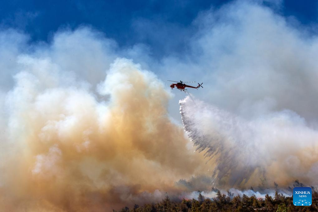 ATHENS, Aug. 12 (Xinhua) -- A large wildfire reached a dozen suburbs of the Greek capital Athens on Monday, leading to the evacuation of thousands of people.